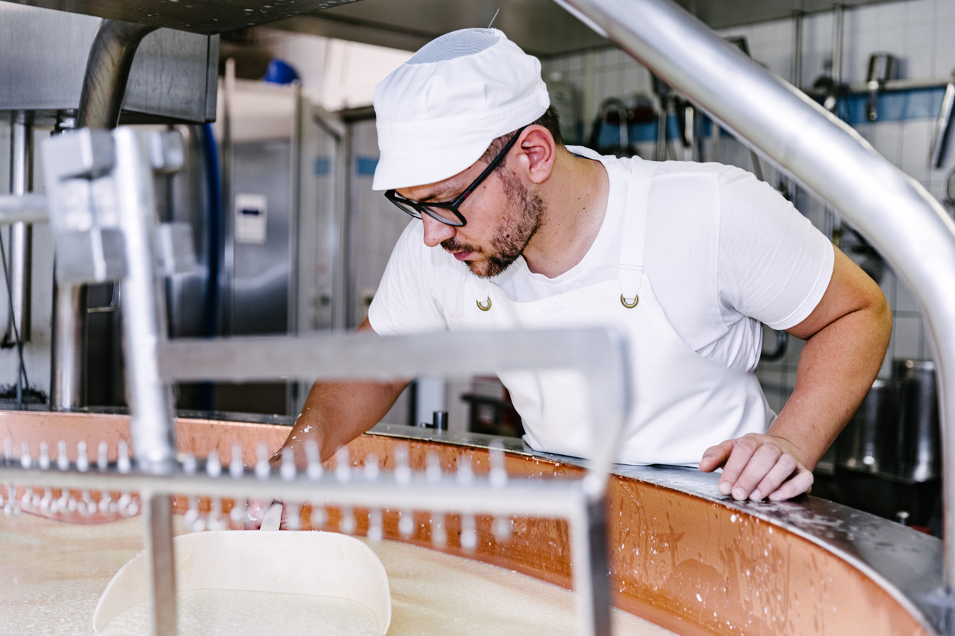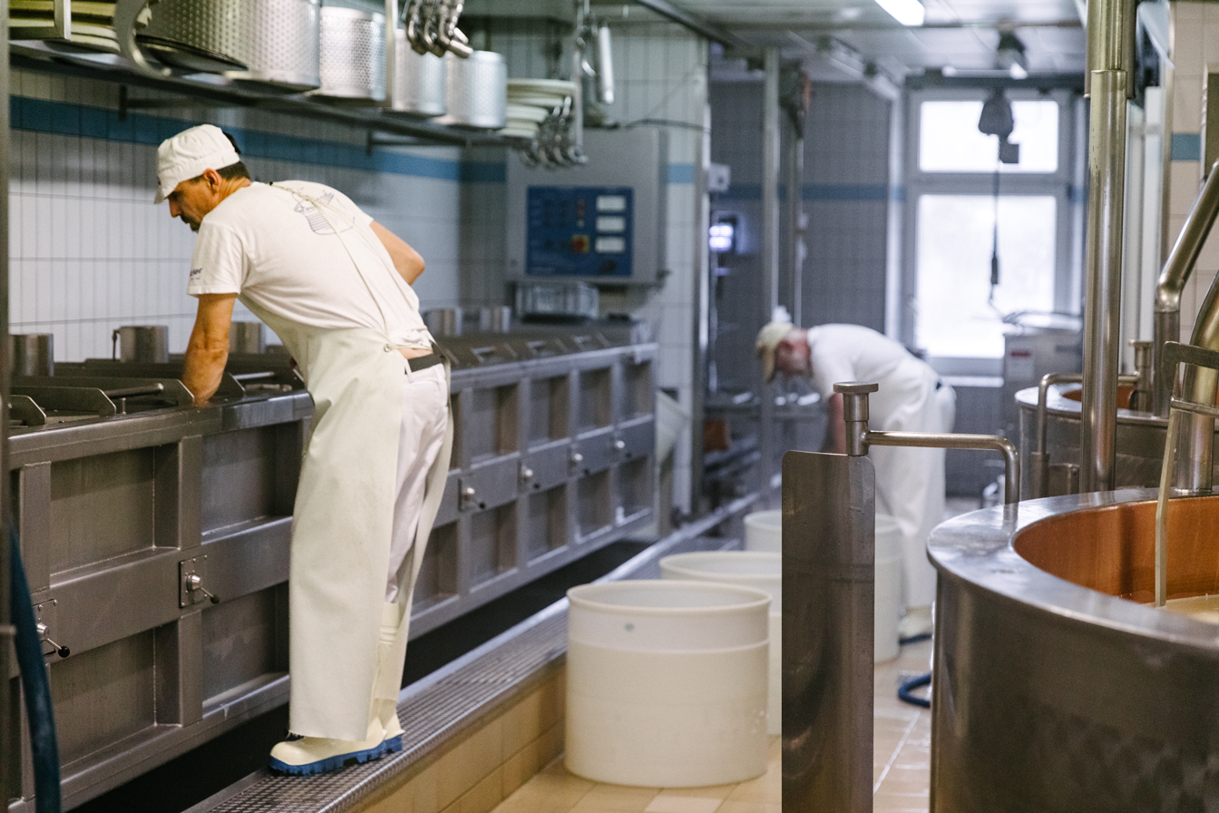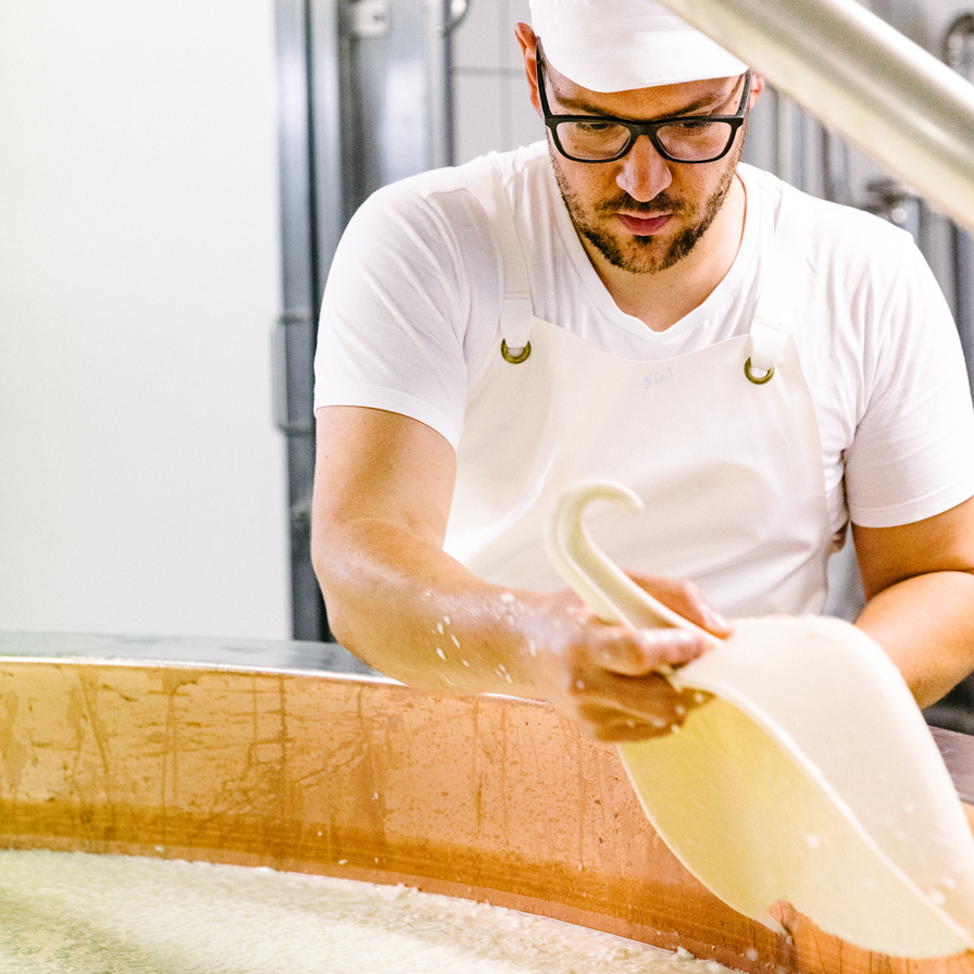 Chaque jour, notre équipe transforme avec passion le lait frais de douze producteurs locaux en Gruyère AOP, le fromage emblématique de notre fromagerie. En complément, nous fabriquons également sur place un mélange maison pour fondue, du sérac, ainsi que de la crème double – des produits laitiers suisses appréciés pour leur authenticité et leur goût.